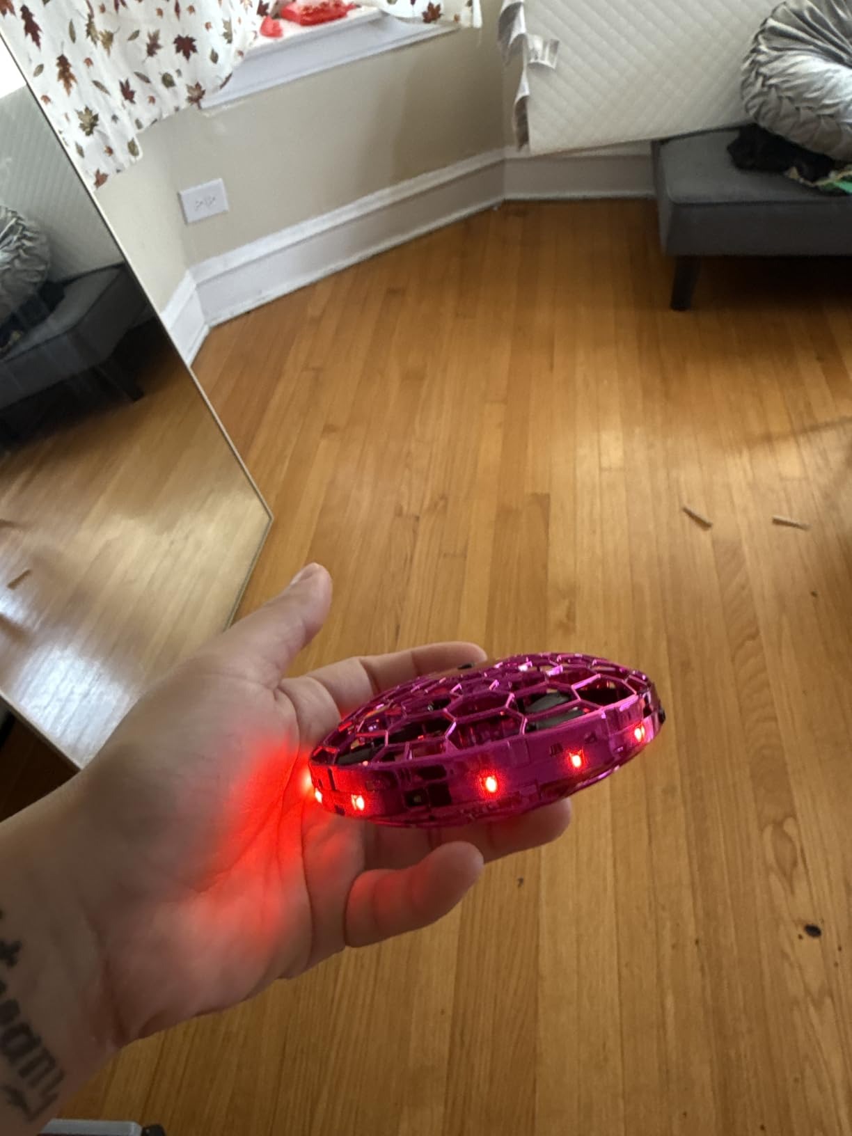 It’s super easy to control—just a wave of the hand sends it gliding smoothly in any direction. The sensors are responsive, so it avoids walls and obstacles without crashing, making it safe for indoor use. The LED lights give it a fun, futuristic look, especially in low light. It’s lightweight, durable, and surprisingly stable in the air. Both kids and adults in my family can’t stop playing with it. A perfect mix of entertainment and tech—highly recommend for fun at home or as a gift!