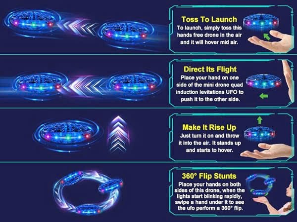 Toss it up and guide it with your hand as the glowing UFO drone flies and flips smoothly.